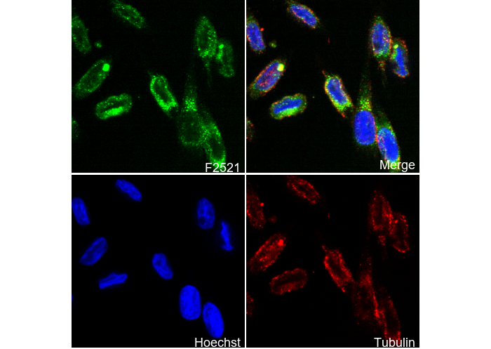 • Immunofluorescent analysis of SW480 cells using F2521 (green, 1:250), Hoechst (blue) and tubulin (Red).