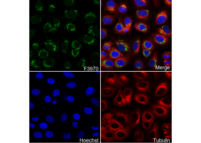 • Immunofluorescent analysis of A549 cells using F3970 (green, 1:50), Hoechst (blue) and tubulin (Red).