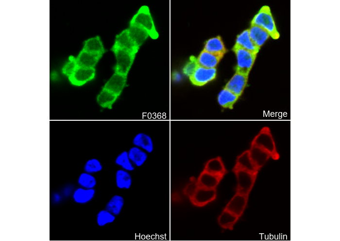 • Immunofluorescent analysis of SK-N-MC cells using F0368 (green, 1:200), Hoechst (blue) and tubulin (Red).