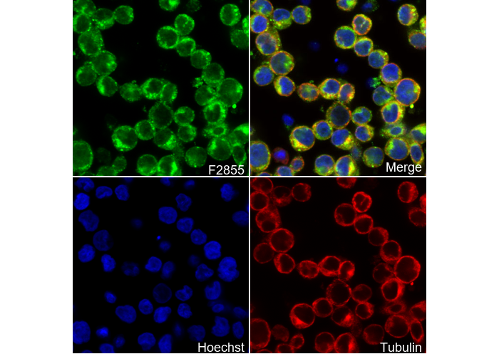 • Immunofluorescent analysis of Raji cells using F2855 (green, 1:100), Hoechst (blue) and tubulin (Red).