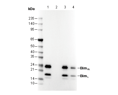 • Lane 1: HAP1 , Lane 2: HAP1 (KO Bim) , Lane 3: Raji , Lane 4: Jurkat