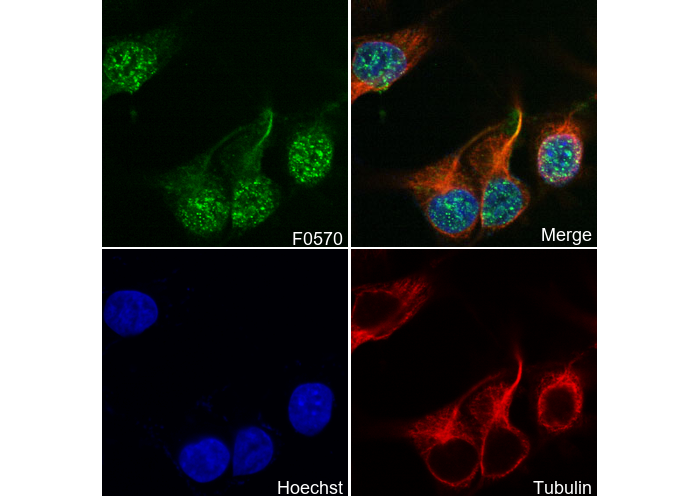 • Immunofluorescent analysis of COS-7 cells using F0570 (green, 1:600), Hoechst (blue) and tubulin (Red).