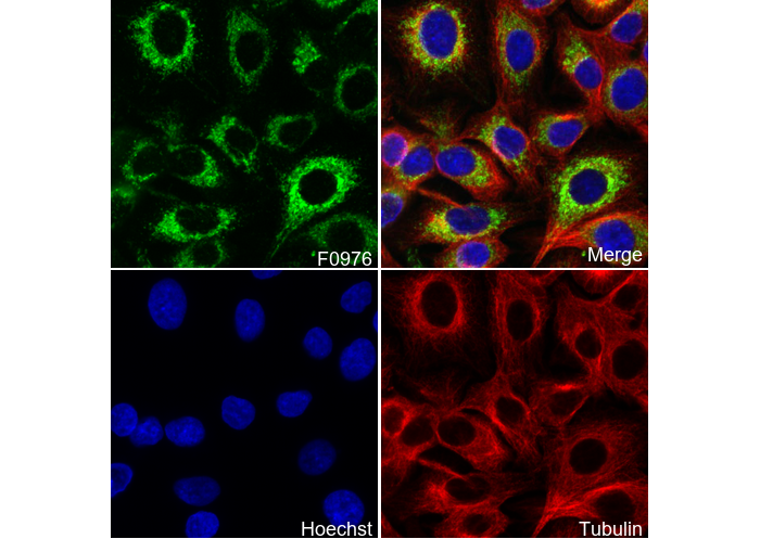• Immunofluorescent analysis of A549 cells using F0976 (green, 1:500), Hoechst (blue) and tubulin (Red).