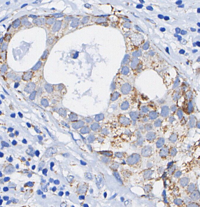 • Immunohistochemical analysis of formalin fixed paraffin embedded human Breast cancer tissue with F0976 at 1/200 dilution.