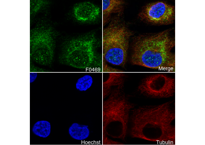 • Immunofluorescent analysis of A-172 cells using F0469 (green, 1:100), Hoechst (blue) and tubulin (Red).