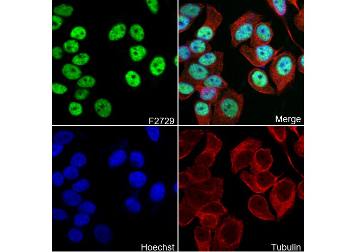 • Immunofluorescent analysis of HepG2 cells using F2729 (green, 1:250), Hoechst (blue) and tubulin (Red).