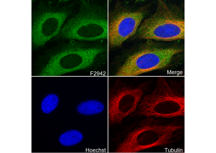 • Immunofluorescent analysis of Hela cells using F2942 (green, 1:50), Hoechst (blue) and tubulin (Red).