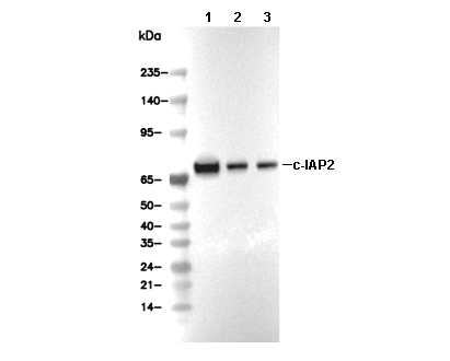 c-IAP2 Antibody [J16G5] detects endogenous levels of total c-IAP2 protein. No cross reactivity was detected with other family members.