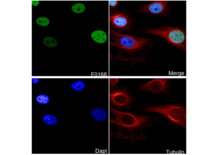 • Immunofluorescent analysis of Hela cells using F0168 (green, 1:200), Hoechst (blue) and tubulin (Red).