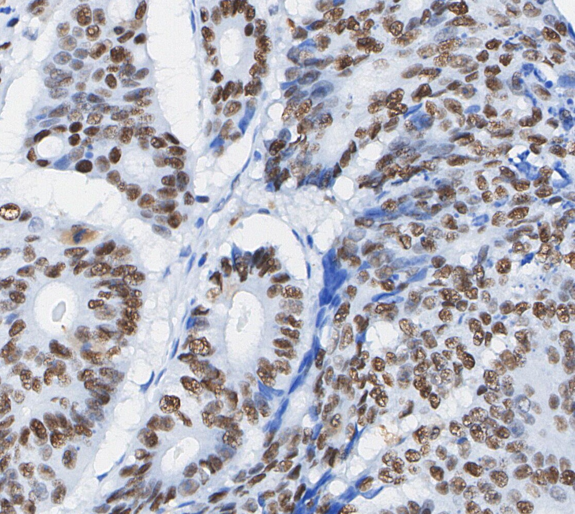 • Immunohistochemical analysis of formalin fixed paraffin embedded human Colorectal cancer tissue with F0168 at 1/100 dilution.