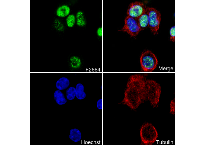 • Immunofluorescent analysis of HT-29 cells using F2664 (green, 1:1600), Hoechst (blue) and tubulin (Red).