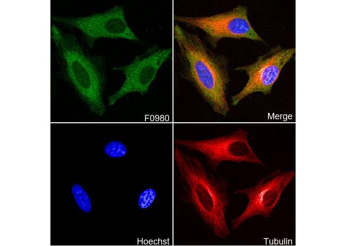 • Immunofluorescent analysis of Hela cells using F0980 (green, 1:100), Hoechst (blue) and tubulin (Red).
