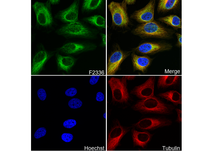 • Immunofluorescent analysis of Hela cells using F2336 (green, 1:100), Hoechst (blue) and tubulin (Red).