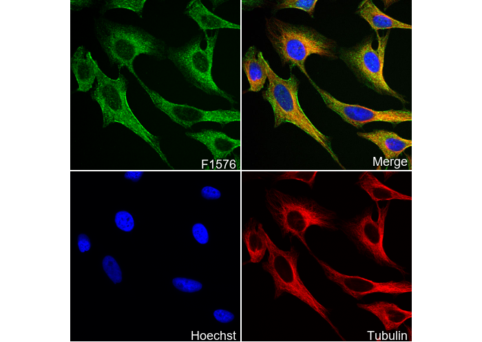 • Immunofluorescent analysis of Hela cells using F1576 (green, 1:148), Hoechst (blue) and tubulin (Red).