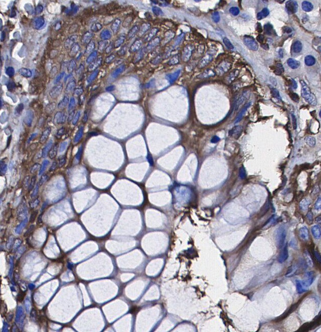 • Immunohistochemical analysis of formalin fixed paraffin embedded human Colorectal cancer tissue with F1080 at 1/100 dilution.
