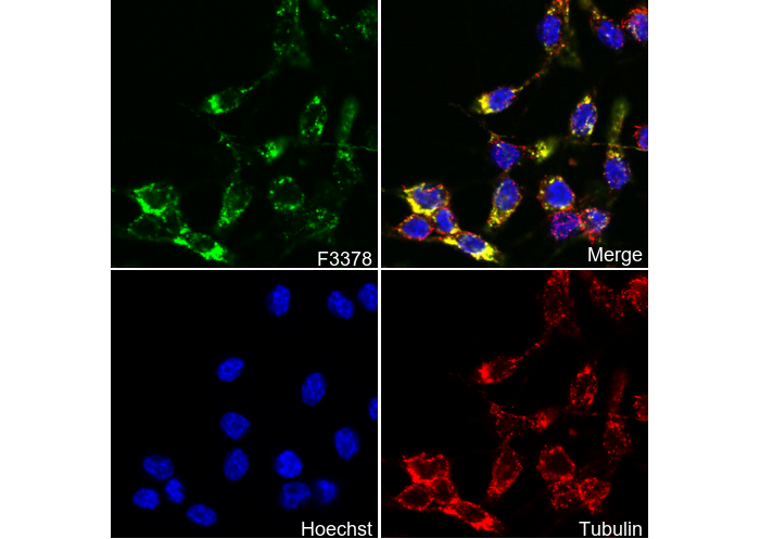 • Immunofluorescent analysis of PC-12 cells using F3378 (green, 1:250), Hoechst (blue) and tubulin (Red).