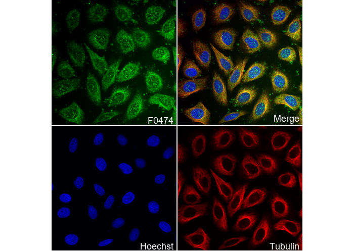 • Immunofluorescent analysis of MCF7 cells using F0474 (green, 1:400), Hoechst (blue) and tubulin (Red).