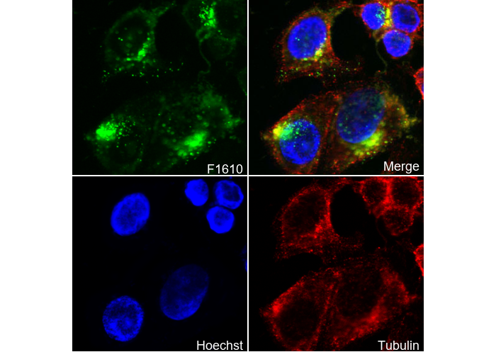 • Immunofluorescent analysis of MCF7 cells using F1610 (green, 1:100), Hoechst (blue) and tubulin (Red).