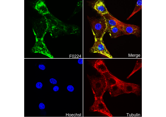 • Immunofluorescent analysis of C2C12 cells using F0224 (green, 1:200), Hoechst (blue) and tubulin (Red).