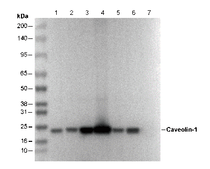 • Lane 1: COS , Lane 2: C2C12 , Lane 3: C6 , Lane 4: CHO , Lane 5: BAEC , Lane 6: Hela , Lane 7: Hela (KO Caveolin-1)