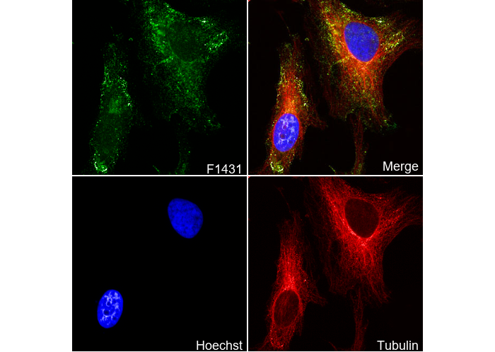 • Immunofluorescent analysis of Hela cells using F1431 (green, 1:100), Hoechst (blue) and tubulin (Red).