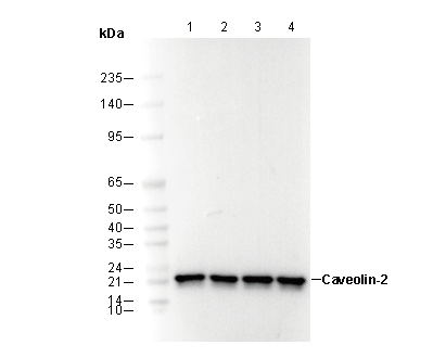 Caveolin-2 Antibody [L20J2] recognizes endogenous levels of total caveolin-2 protein. Based on amino acid sequence, the antibody is not expected to cross-react with caveolin-1 or caveolin-3.