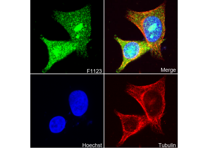 • Immunofluorescent analysis of MCF-7 cells using F1123 (green, 1:100), Hoechst (blue) and tubulin (Red).