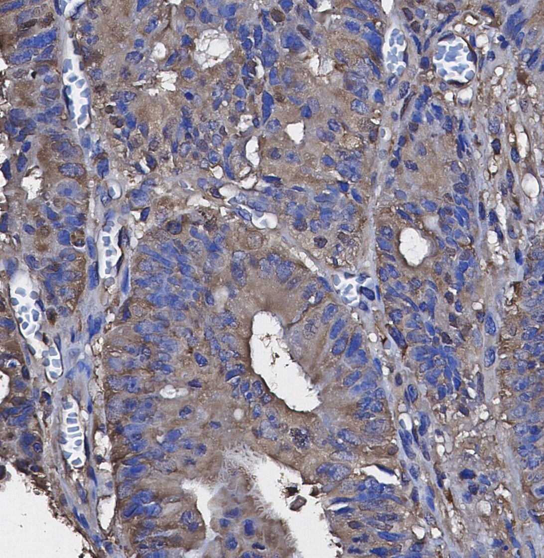 • Immunohistochemical analysis of formalin fixed paraffin embedded human Colorectal Cancer tissue with F1123 at 1/100 dilution.