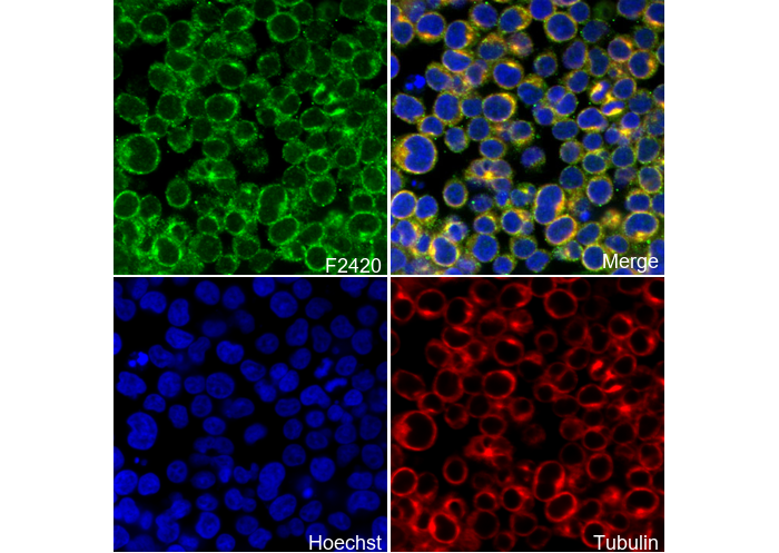 • Immunofluorescent analysis of Jurkat cells using F2420 (green, 1:50), Hoechst (blue) and tubulin (Red).