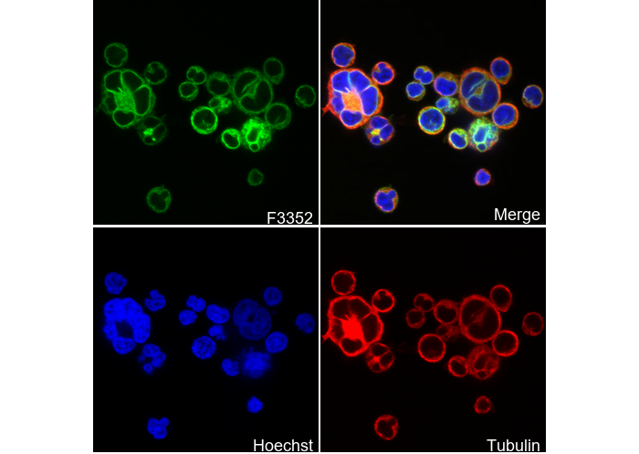 • Immunofluorescent analysis of Jurkat cells using F3352 (green, 1:500), Hoechst (blue) and tubulin (Red).