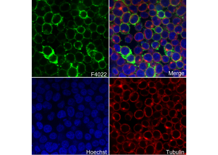 • Immunofluorescent analysis of Jurkat cells using F4022 (green, 1:100), Hoechst (blue) and tubulin (Red).