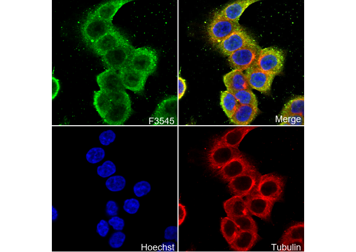 • Immunofluorescent analysis of HT-29 cells using F3545 (green, 1:200), Hoechst (blue) and tubulin (Red).