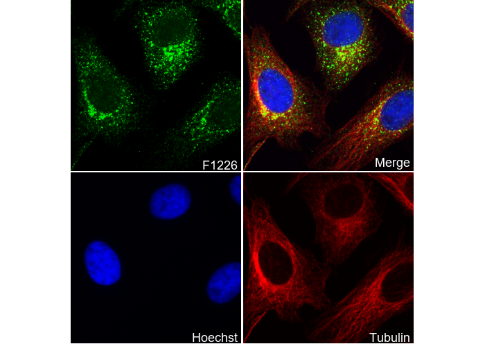 • Immunofluorescent analysis of Hela cells using F1226 (green, 1:100), Hoechst (blue) and tubulin (Red).