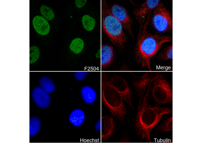 • Immunofluorescent analysis of Hela cells using F2504 (green, 1:100), Hoechst (blue) and tubulin (Red).