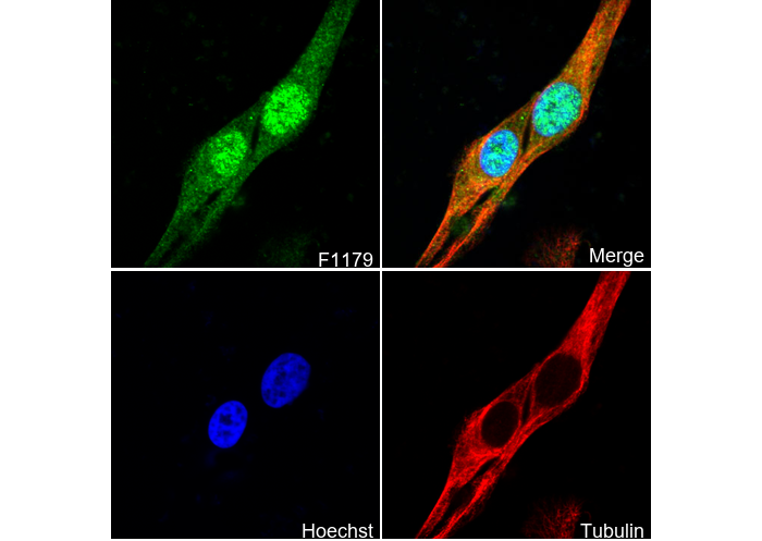 • Immunofluorescent analysis of Hela cells using F1179 (green, 1:50), Hoechst (blue) and tubulin (Red).