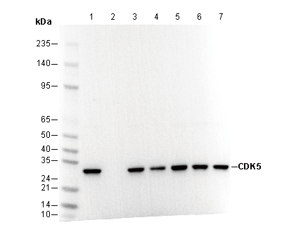 • Lane 1: HAP1 , Lane 2: HAP1 (KO CDK5) , Lane 3: SHSY5Y , Lane 4: MCF7 , Lane 5: HeLa , Lane 6: PC-12 , Lane 7: NIH/3T3