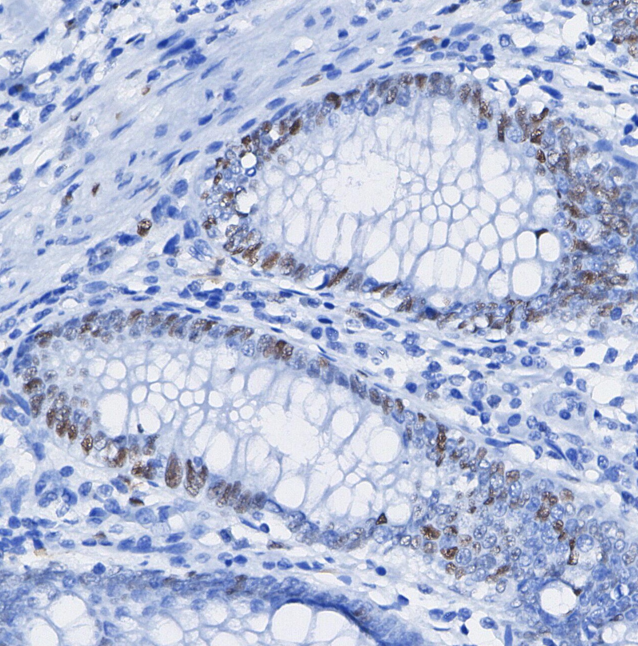 • Immunohistochemical analysis of formalin fixed paraffin embedded human Colorectal cancer tissue with F0530 at 1/100 dilution.