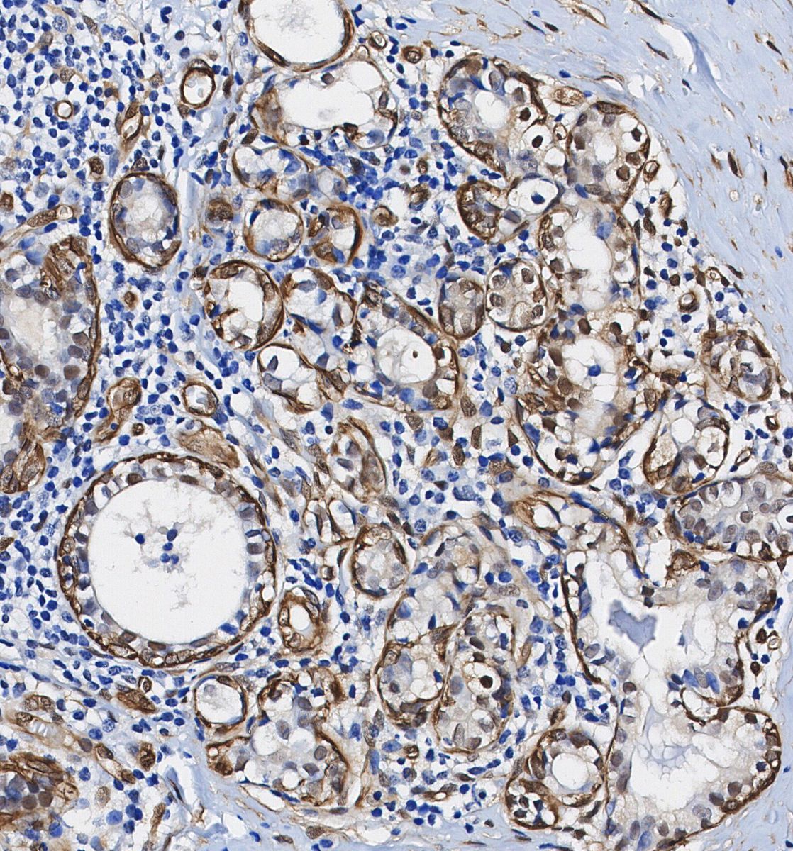 • Immunohistochemical analysis of formalin fixed paraffin embedded human Breast Cancer tissue with F1180 at 1/100 dilution.