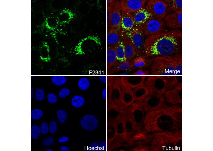 • Immunofluorescent analysis of BxPC-3 cells using F2841 (green, 1:500), Hoechst (blue) and tubulin (Red).