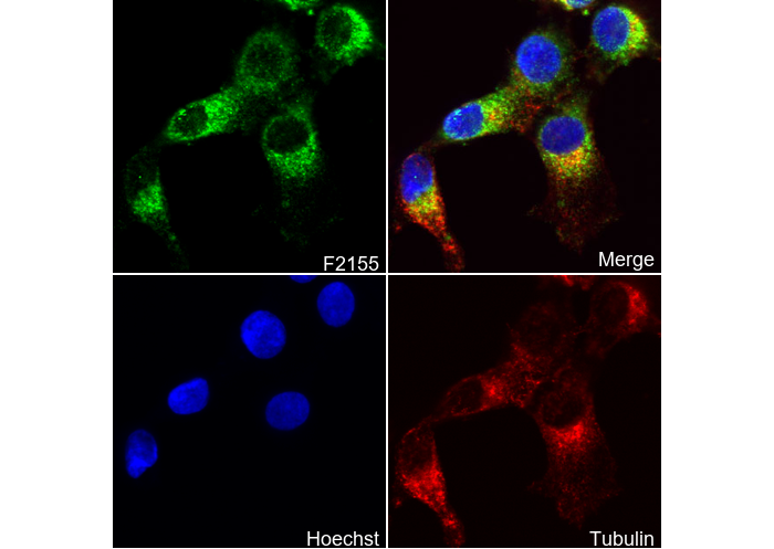 • Immunofluorescent analysis of NIH/3T3 cells using F2155 (green, 1:50), Hoechst (blue) and tubulin (Red).