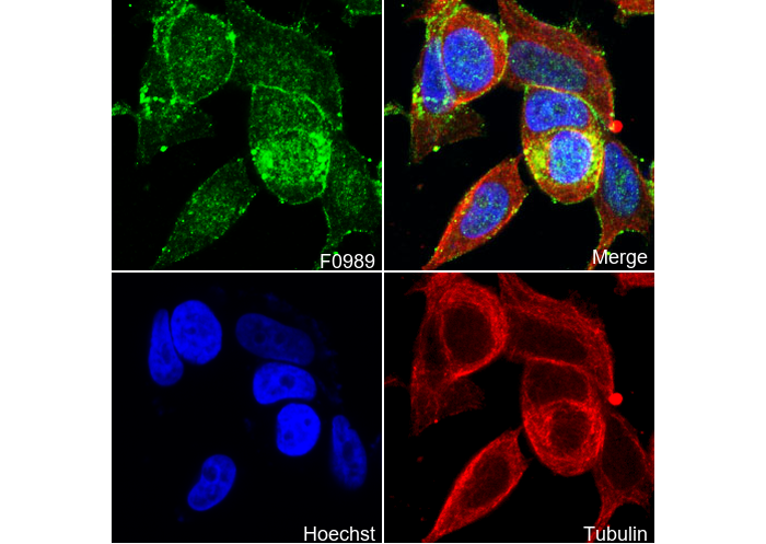 • Immunofluorescent analysis of MCF-7 cells using F0989 (green, 1:100), Hoechst (blue) and tubulin (Red).