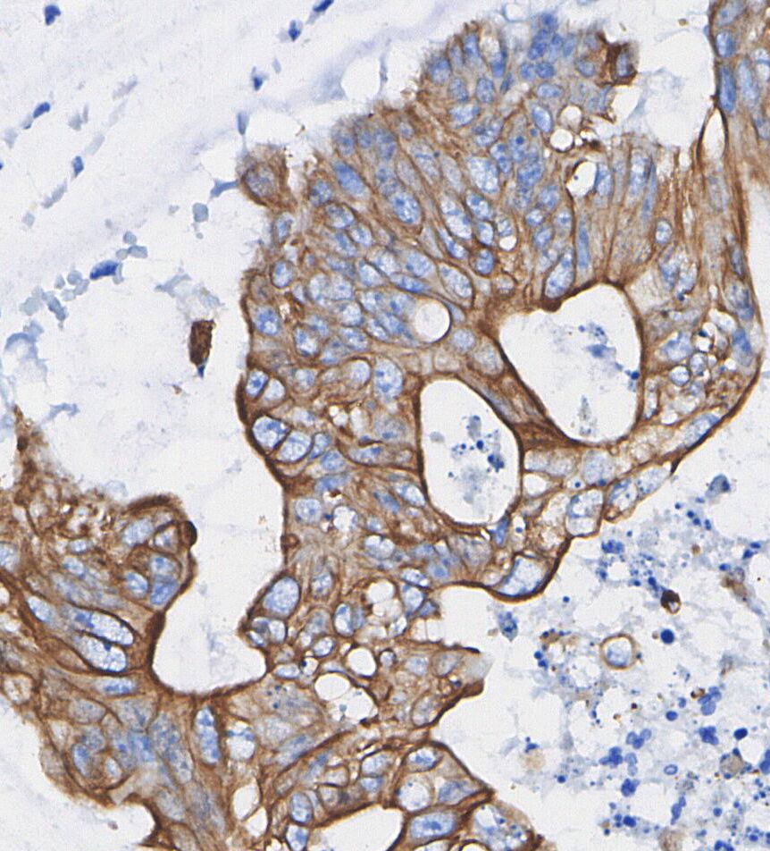 • Immunohistochemical analysis of formalin fixed paraffin embedded human Colorectal cancer tissue with F0989 at 1/100 dilution.