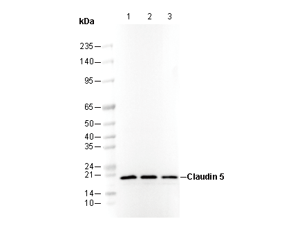 Claudin 5 Antibody [K7A2] recognizes endogenous levels of total Claudin 5 protein.