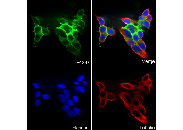 • Immunofluorescent analysis of SH-SY5Y cells using F4337 (green, 1:500), Hoechst (blue) and tubulin (Red).