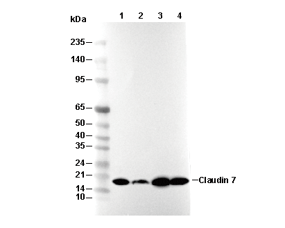 Claudin 7 Antibody [M7D16] detects endogenous levels of total Claudin 7 protein.