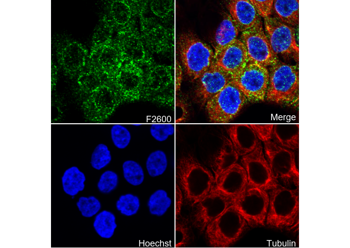 • Immunofluorescent analysis of A431 cells using F2600 (green, 1:50), Hoechst (blue) and tubulin (Red).