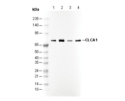 CLCA1 Antibody [C10D16] recognizes endogenous levels of total CLCA1 protein.