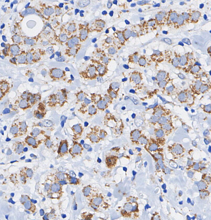 • Immunohistochemical analysis of formalin fixed paraffin embedded human Breast cancer tissue with F2088 at 1/100 dilution.
