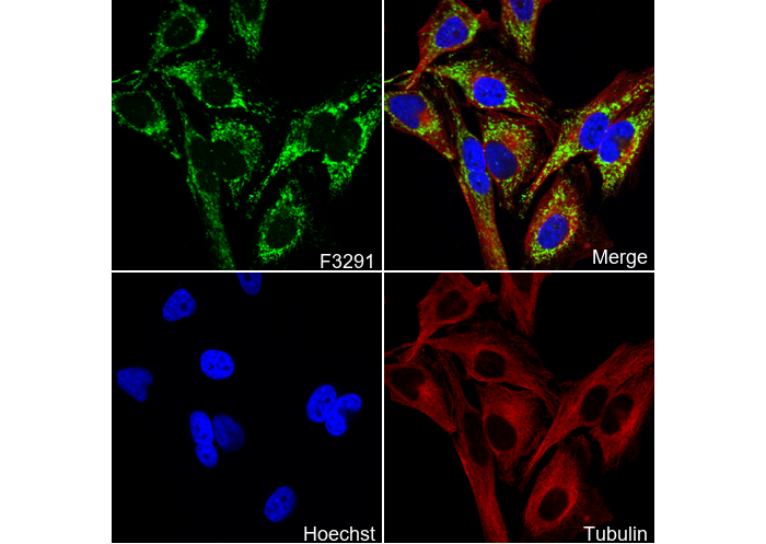 • Immunofluorescent analysis of Hela cells using F3291 (green, 1:100), Hoechst (blue) and tubulin (Red).