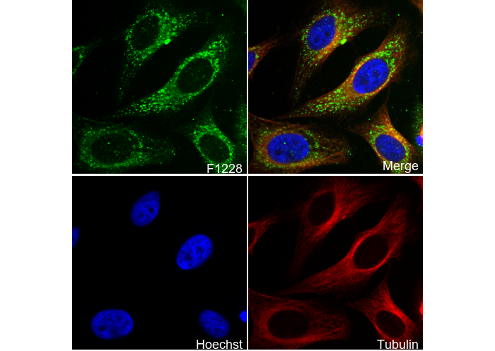 • Immunofluorescent analysis of Hela cells using F1228 (green, 1:100), Hoechst (blue) and tubulin (Red).